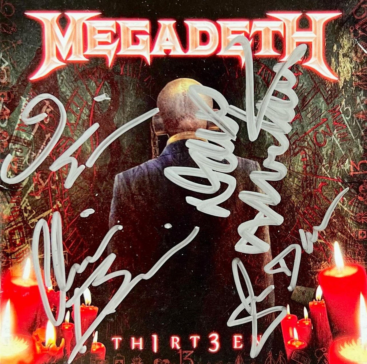 Este CD de "Th1rt3en" de Megadeth está firmado por todos los miembros de la banda en su formación de 2011. Con temas destacados como "Public Enemy No. 1", "Sudden Death", y "Never Dead", el álbum representa un regreso poderoso al sonido clásico del thrash metal. Las firmas de Dave Mustaine, David Ellefson, Chris Broderick, y Shawn Drover añaden un valor único a esta edición.