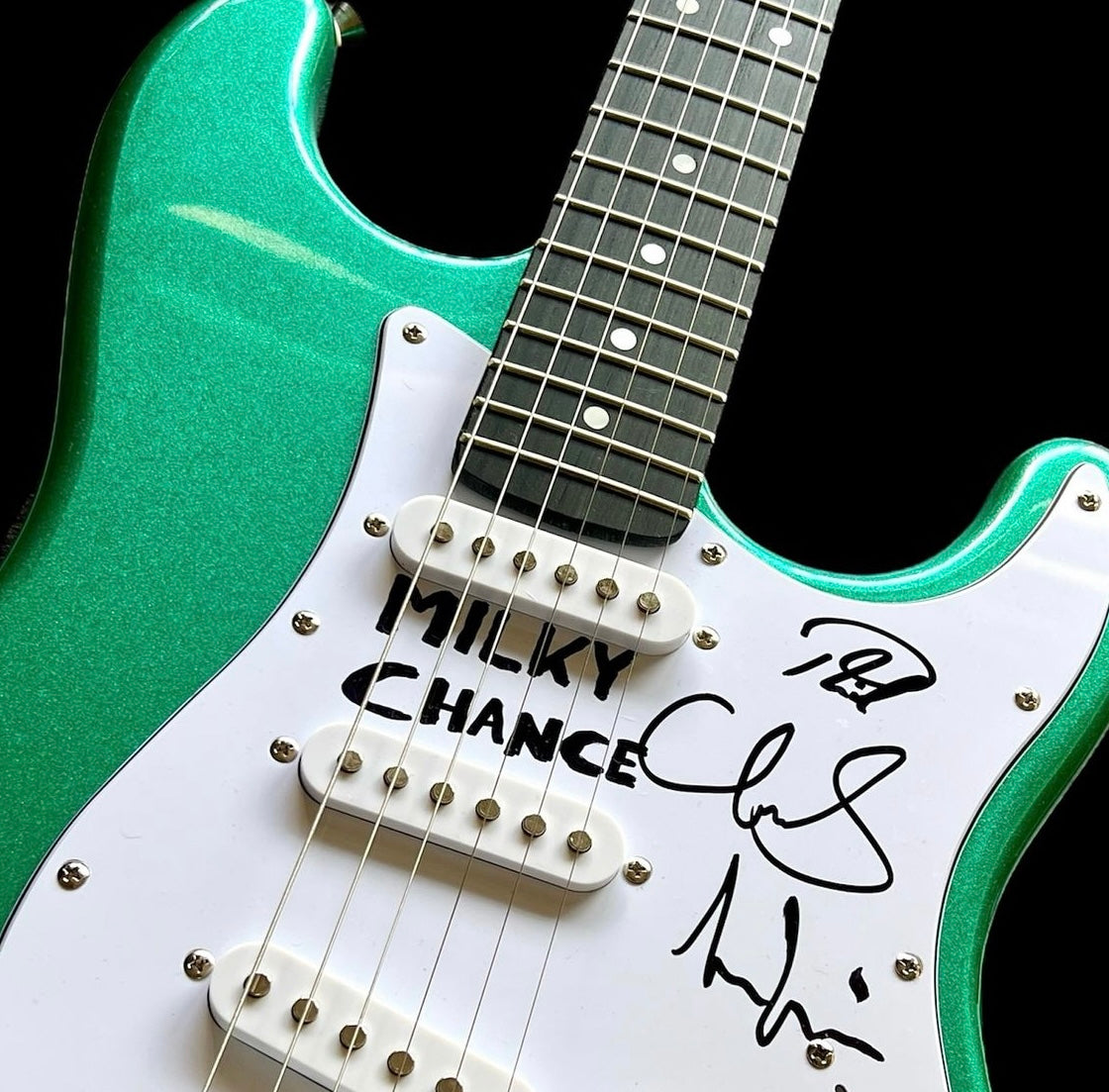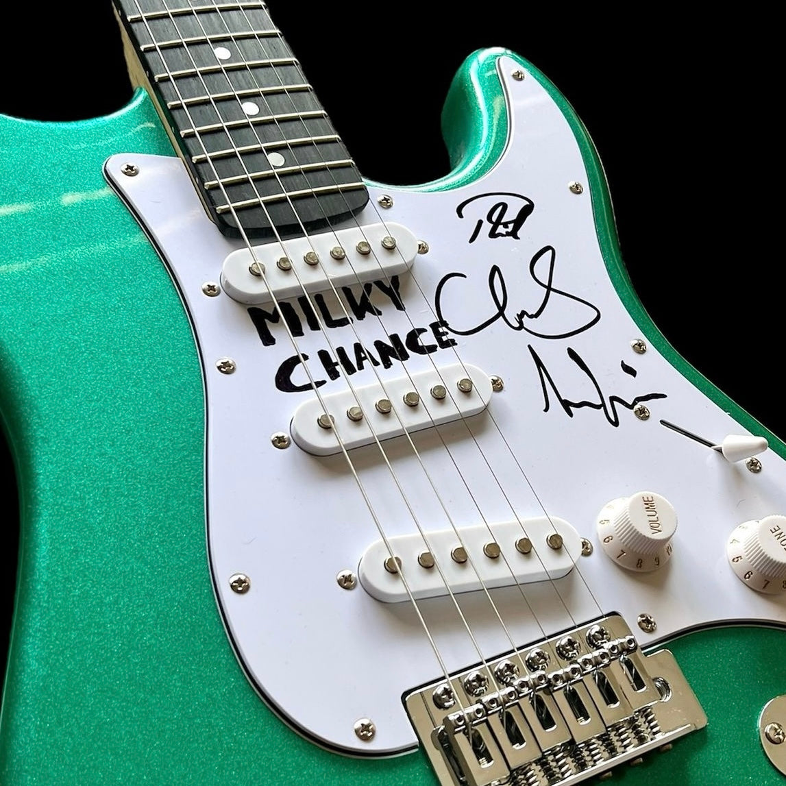 ¡No te pierdas esta pieza única firmada por Milky Chance! Además, incluimos fotos y videos exclusivos del momento en que la banda firmó este artículo. Milky Chance, conocidos por su hit 'Stolen Dance' y su fusión de folk, reggae y electrónica, han dejado su huella en este coleccionable. Obtén autenticidad garantizada y un pedazo de la historia musical con este artículo único.