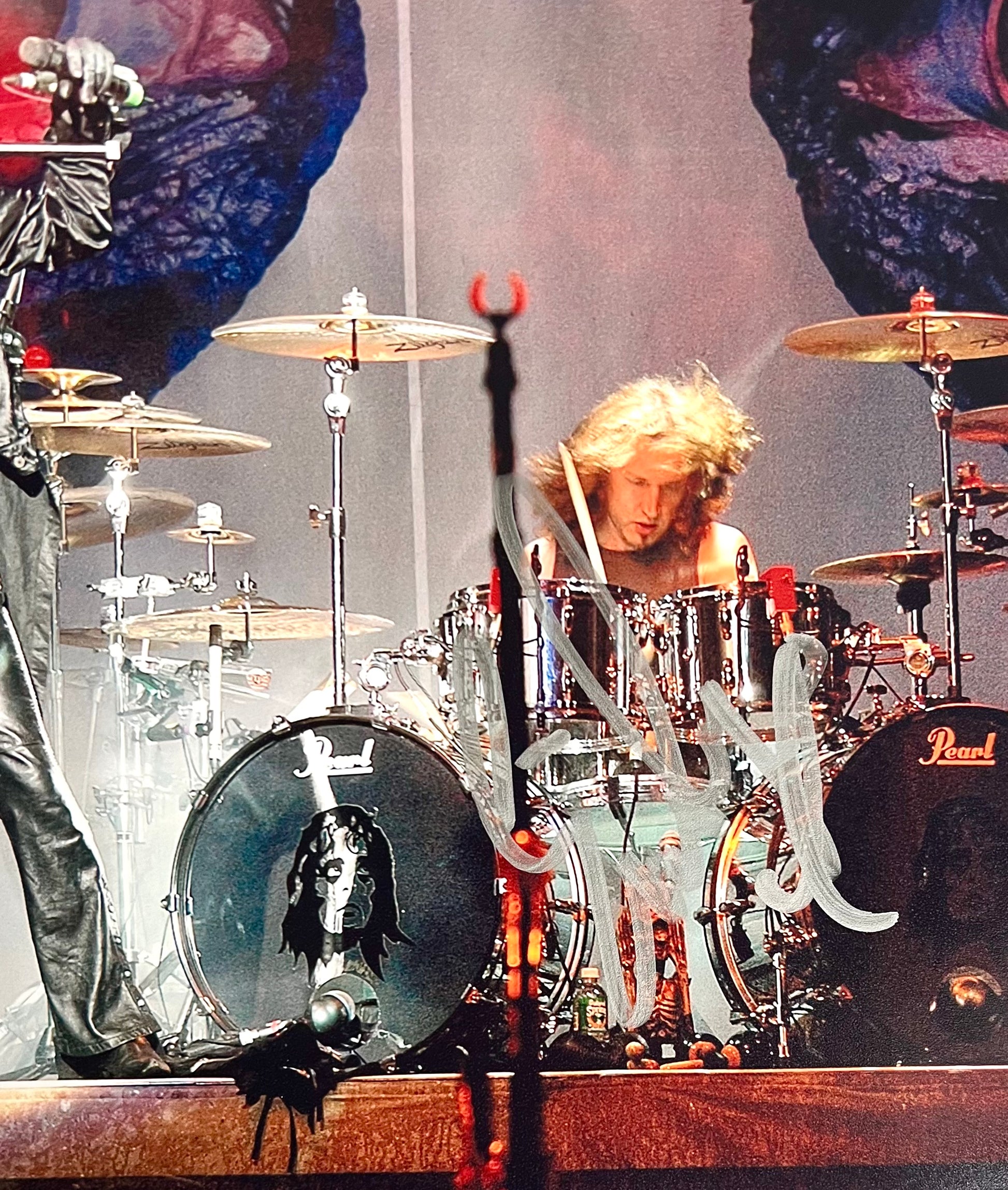 Su firma en esta imagen añade un toque de autenticidad a una obra que captura la energía y el espíritu inquebrantable de uno de los bateristas más respetados en el mundo del rock.