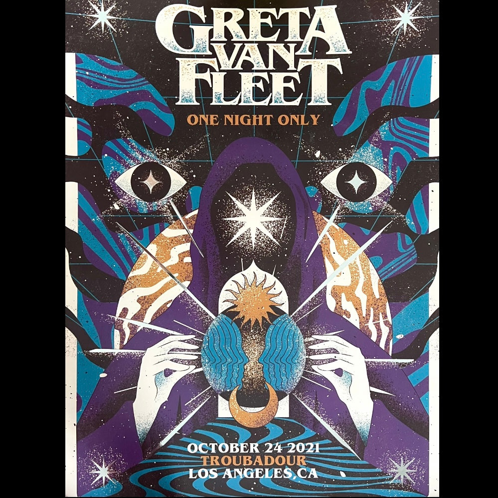 Este cautivador póster conmemora la histórica actuación de Greta Van Fleet en el legendario Troubadour en 2021.