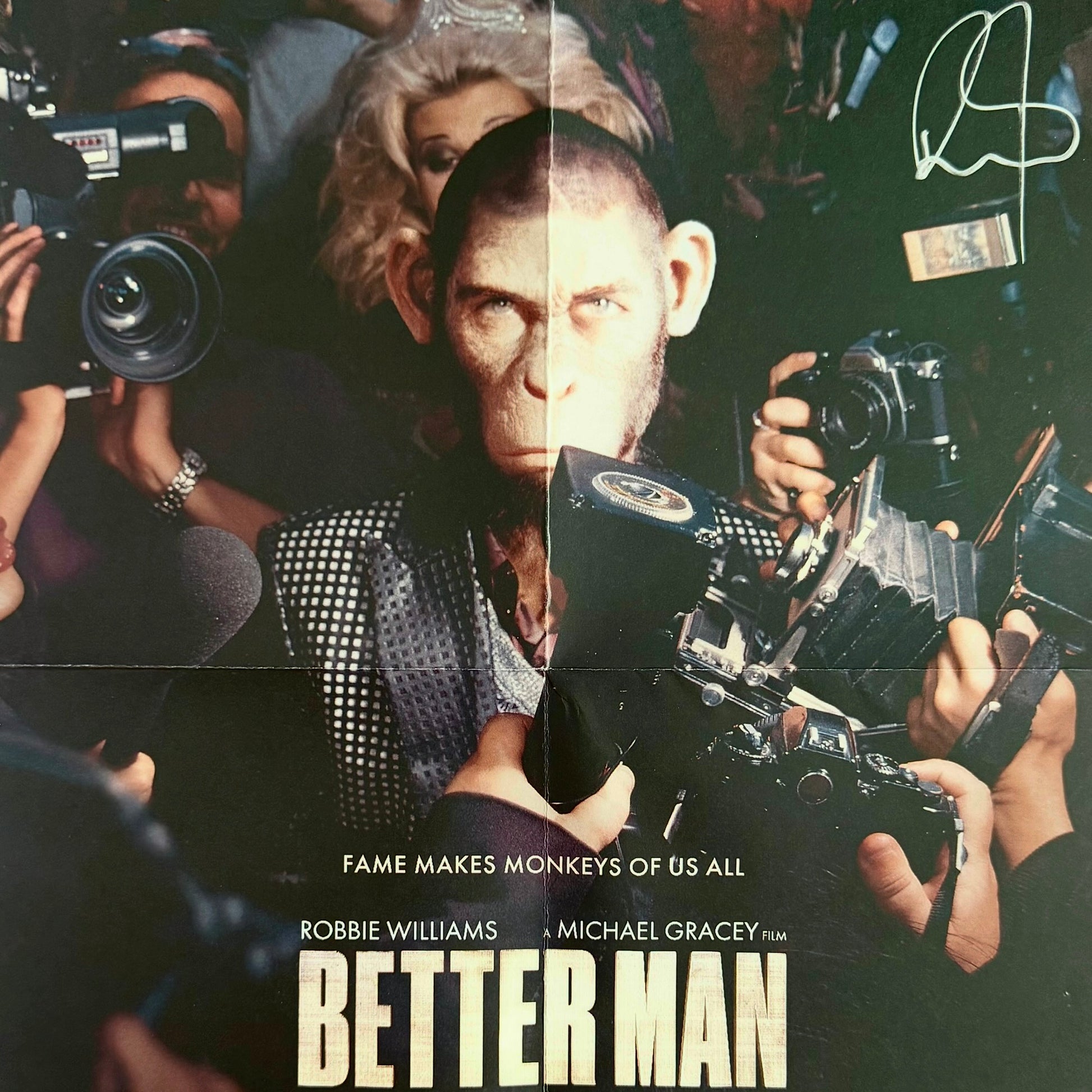 Este exclusivo póster autografiado por Robbie Williams celebra su más reciente proyecto cinematográfico, A Better Man, una película que promete revelar aspectos profundos y personales de su vida y carrera. La imagen captura a Robbie en una pose icónica, reflejando su magnetismo y carisma únicos que han conquistado a millones de fanáticos en todo el mundo.