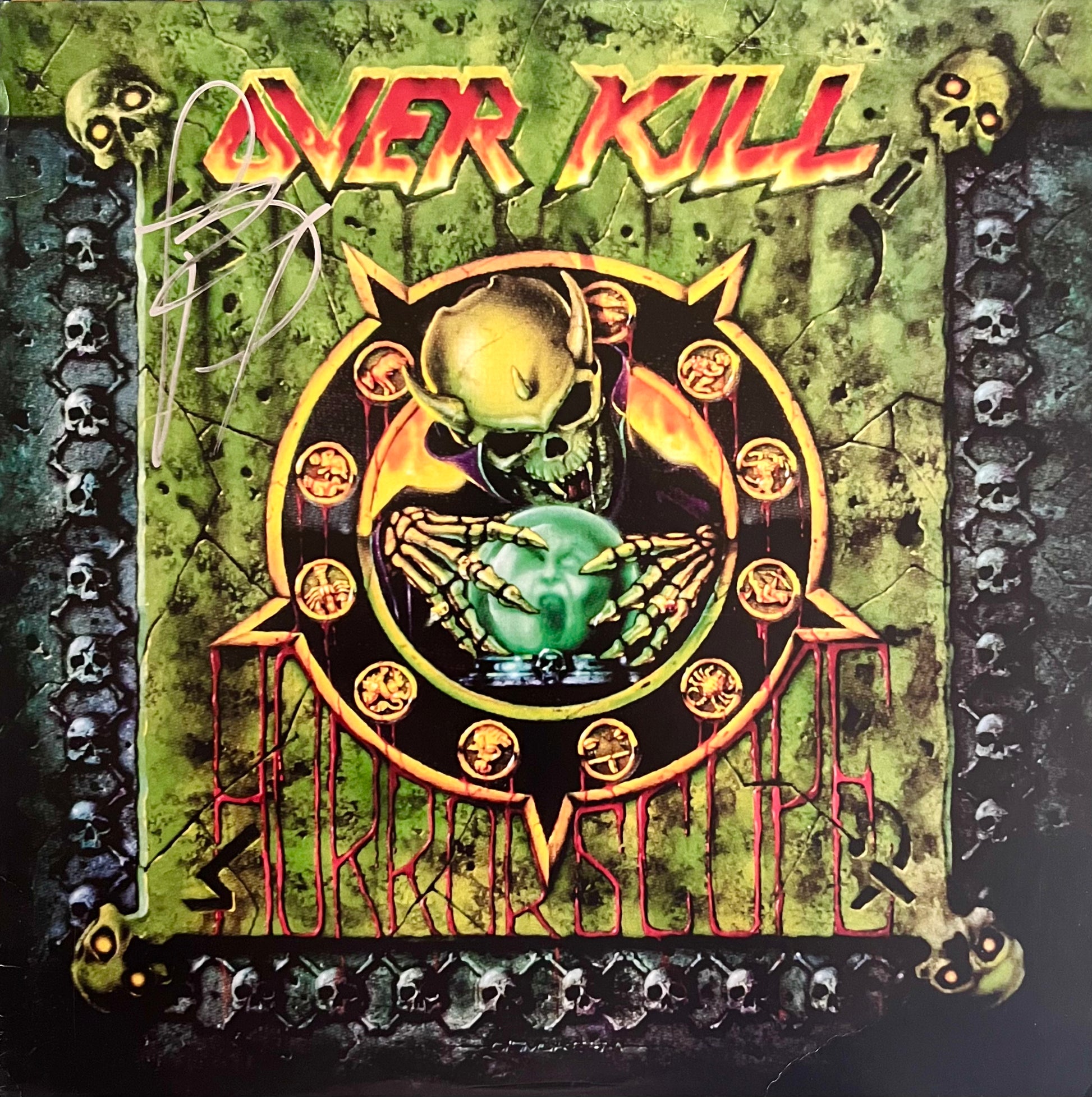El vinilo Horrorscope de Overkill, firmado por el increíble Bobby "Blitz" Ellsworth. No es solo un disco; es una experiencia que captura la esencia pura del thrash metal y la energía de una de las bandas más influyentes del género.